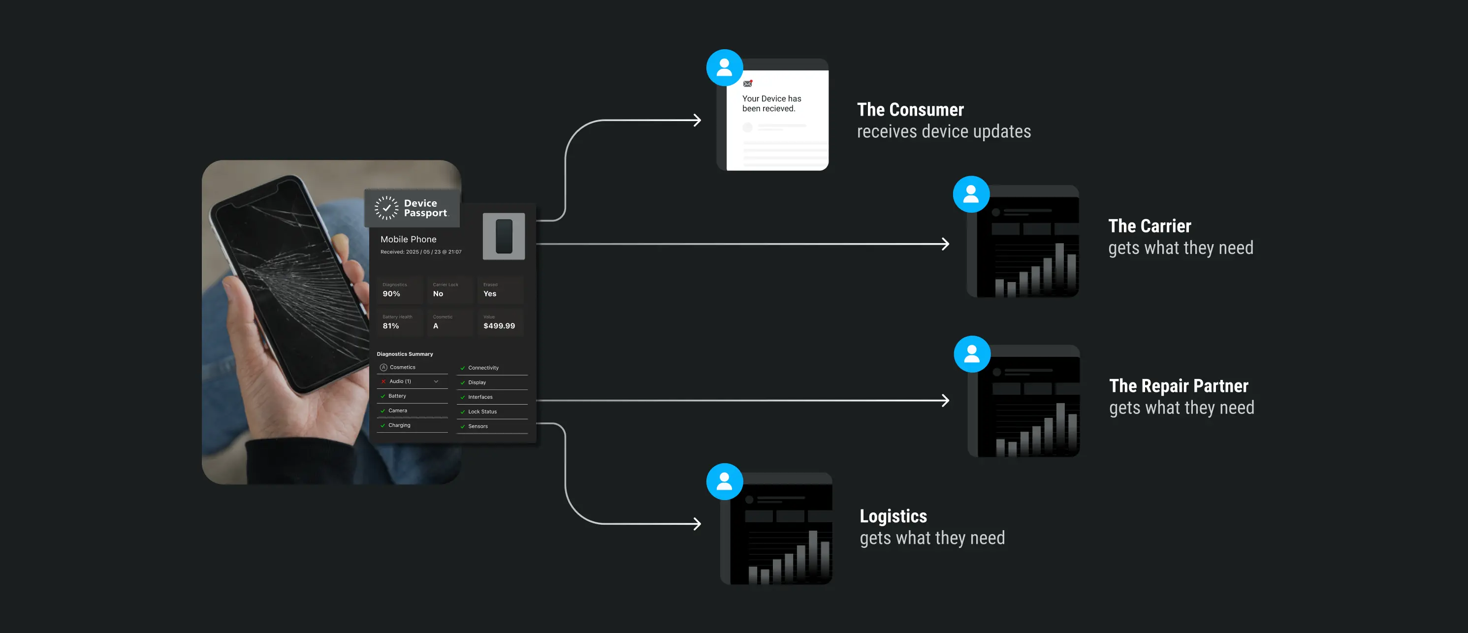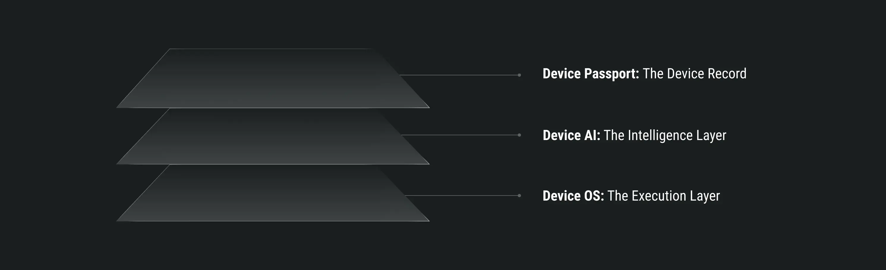 Every action Device OS captures, and every decision Device AI makes, is written into the Device Passport, an append-only, event-based history of a device's identity, condition, repair history, and value. The same underlying record is surfaced differently depending on who is asking.
